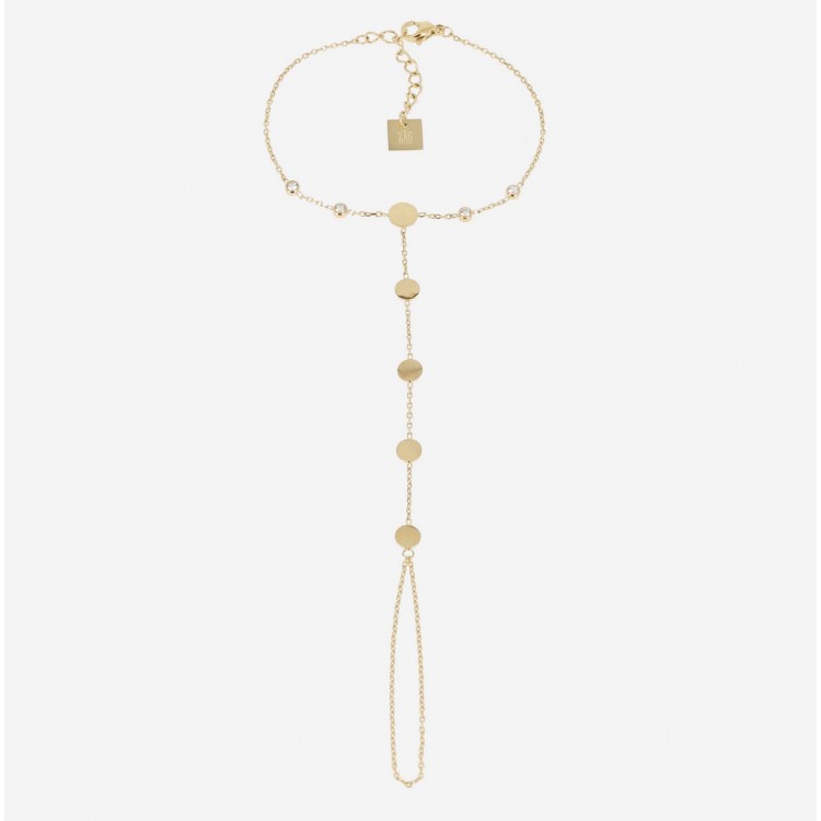 Bijou de main en acier doré à l'or fin par ionisation serti de plusieurs pastilles rondes en acier et de petits zirconiums.