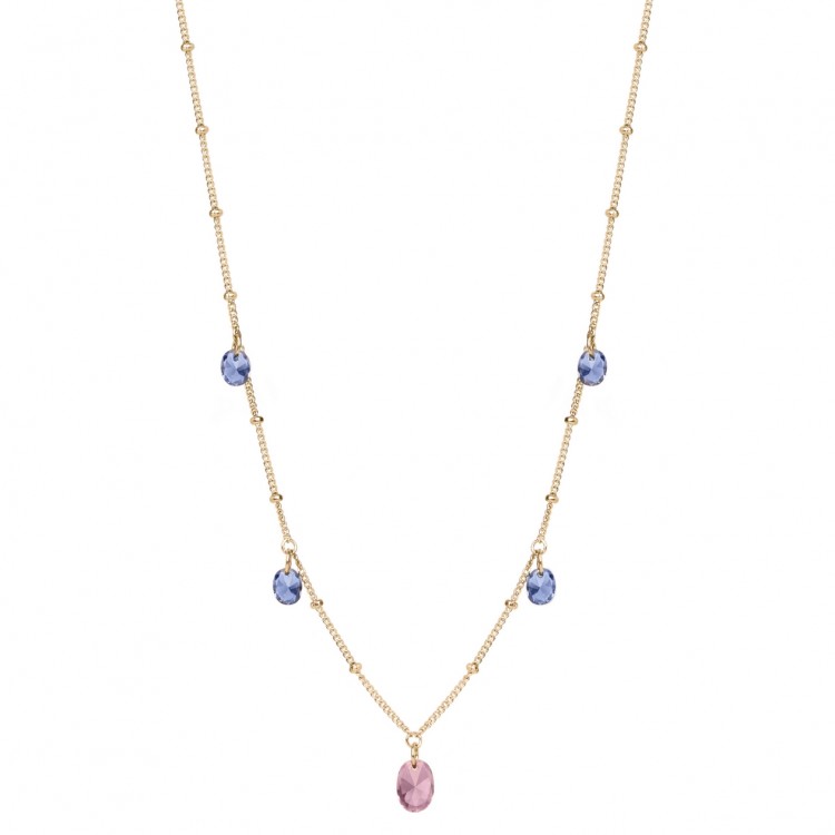 Collier en plaqué or avec pampilles d’oxydes aux teintes rose et bleu. Ligne fine et colorée.