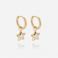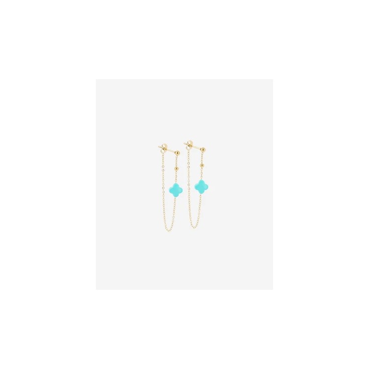 Boucles d'oreilles pendantes en acier doré à l'or fin par ionisation sur lesquelles est attachée une pierre naturelle facettée en forme de trèfle.