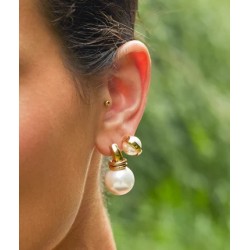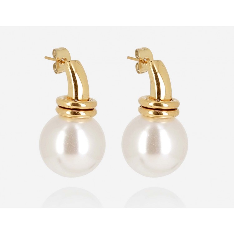 Boucles d'oreilles en acier doré à l'or fin par ionisation composée d'un empiècement en acier auquel sont reliés deux anneaux en acier et d'une perle.