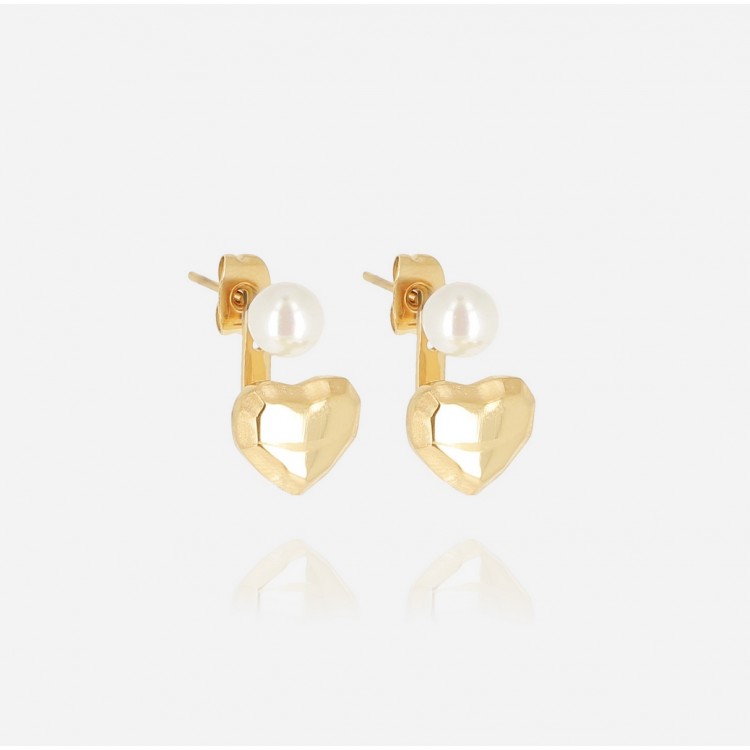 Boucles d'oreilles en acier uni ou doré à l'or fin par ionisation sertie d'une perle. Elle est en forme de J qui passe derrière le lobe et se termine par un cœur.