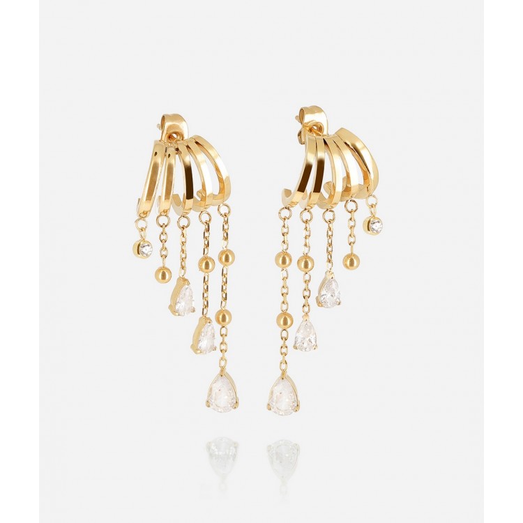 Boucles d'oreilles multi créoles en acier uni ou doré à l'or fin par ionisation composées de 5 anneaux alignés créant un effet d'accumulation. L'un des anneaux est sertis de zirconiums.